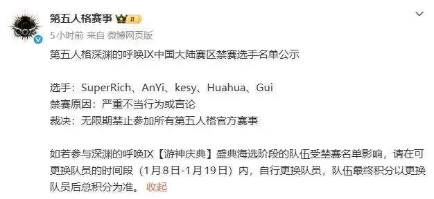 最新版-第五人格五名选手被永久禁赛,原因包括:谈未成年、发不雅照等